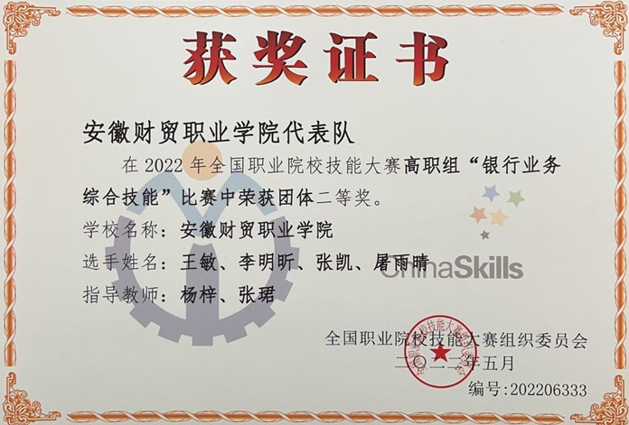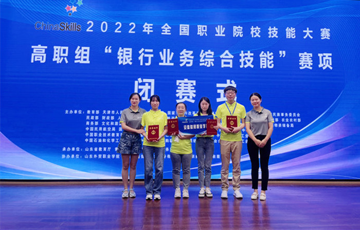 8月14日至15日,2022年全国职业院校技能大赛高职组“银行业务综合技能”赛项在山东外贸职业学院举行,来自全国的220名选手参赛同台竞技,经过激烈角逐,我校财会金融学院的王敏、李明昕、屠雨晴、张凯四名同学组成的代表队在杨梓、张珺老师指导下获得团体二等奖。