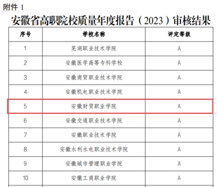 近日,在《安徽省教育厅关于公布高等职业院校质量年度报告(2023)审核结果的通知》中,我校质量年度报告(2023)荣获A档。自2020年省教育厅组织质量年报评审以来,我校连续三年获得A档。