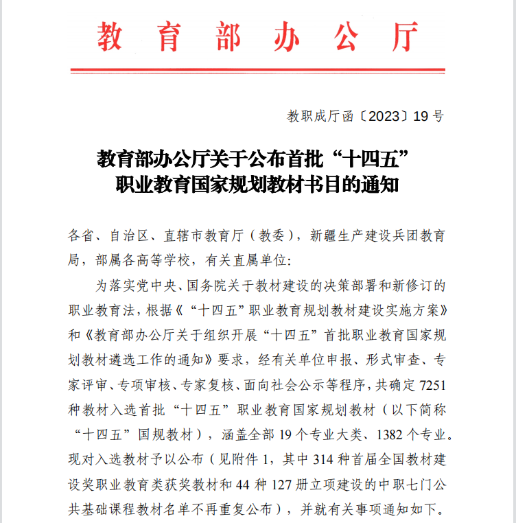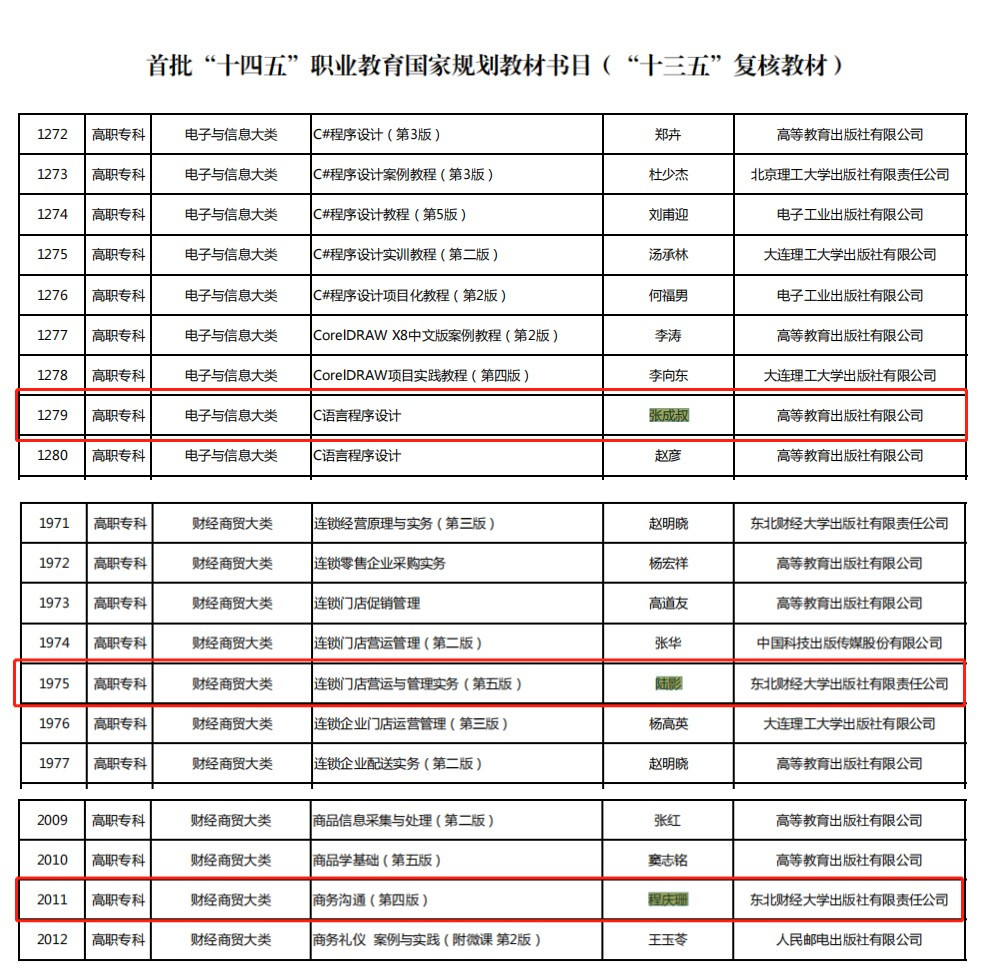 近日,教育部办公厅发布了《关于公布首批“十四五”职业教育国家规划教材书目的通知》,我校张成叔老师主编的两本教材《信息技术基础》(第三版)和《C语言程序设计》、陆影老师主编的《连锁门店营运与管理实务》(第五版)和程庆珊老师主编的《商务沟通》(第四版)四本教材成功入选首批“十四五”职业教育国家规划教材。