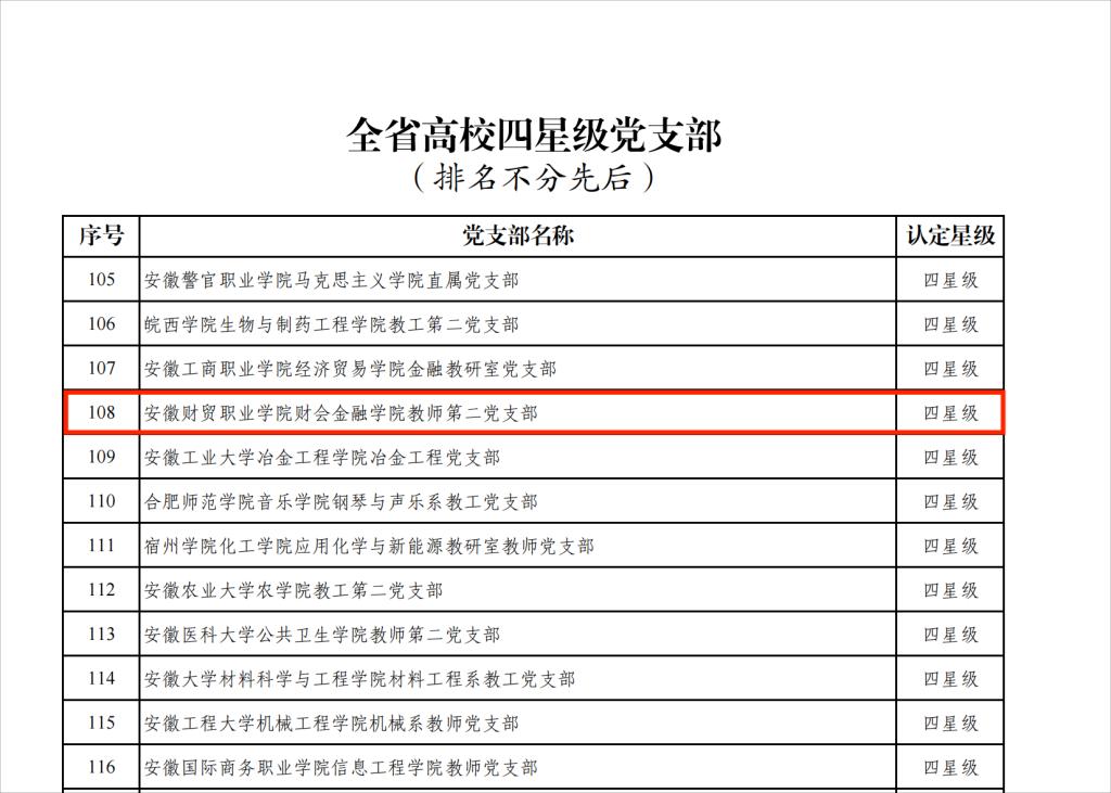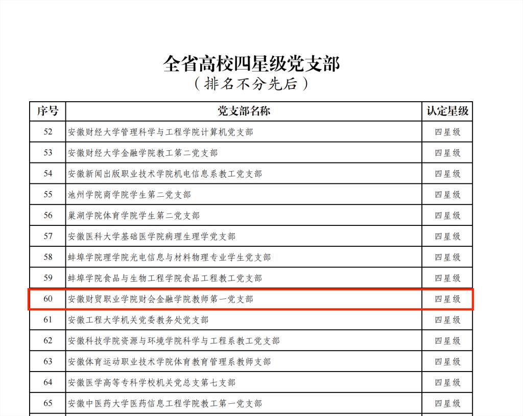 近日,中共安徽省委教育工委公布了《关于命名四星级和五星级党支部的决定》,我校财会金融学院教师第一党支部、财会金融学院教师第二党支部获批全省高校“四星级党支部”。
