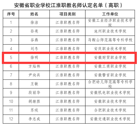 近日,安徽省教育厅印发《安徽省教育厅关于公布安徽省首批“六百工程”项目名单的通知》,我校徐明老师入选“安徽省职业学校江淮职教名师”、学校与安诚财务咨询有限公司合作的“财务咨询服务业产教融合示范基地创新模式研究”入选“安徽省职业学校产业专业合作链双链长”。
