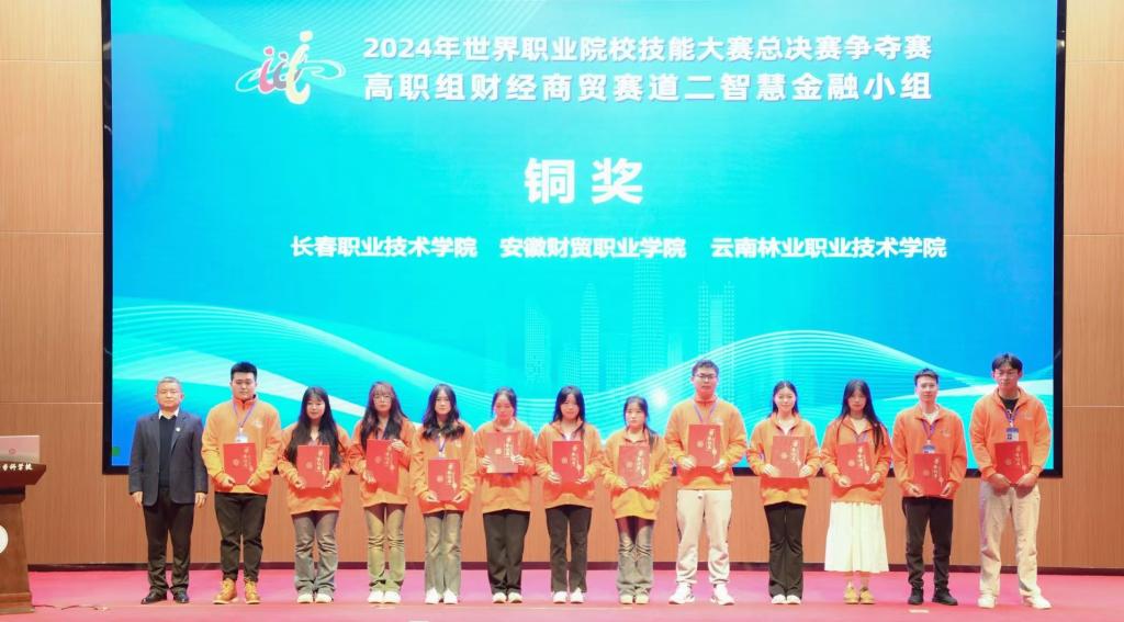 10月27日至29日,世界职业院校技能大赛高职组财经商贸类智慧金融项目在长春金融高等专科学校举行,60所职业院校战队跨省竞技。我校由潘睿、张凤指导的智慧金融队金婷婷、商夏、汪渝涵、陈功参赛团队获大赛铜奖。