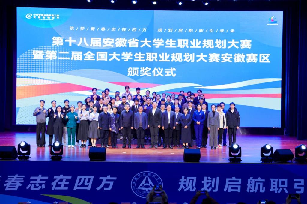 3月3日,第十八届安徽省大学生职业规划大赛暨第二届全国大学生职业规划大赛安徽赛区决赛圆满落幕。经过激烈角逐,我校学子发挥出色,财会金融学院财管2201班学生靳蕊、公共教学部食品2302班学生管理分别斩获就业赛道(职教组)、成长赛道(职教组)金奖,文化创意学院环艺2304班学生罗心蕊获成长赛道(职教组)银奖,学校蝉联“优秀组织奖”,成绩再创新高。