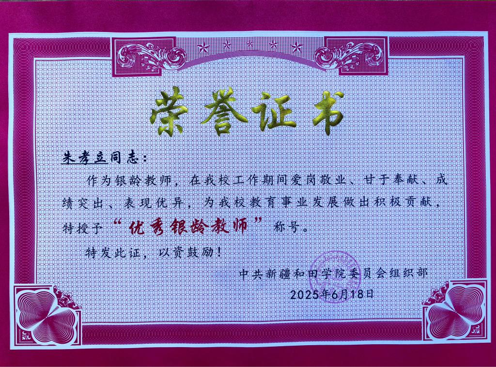 近日,从新疆和田学院传来喜讯,学校银龄教师朱孝立凭借出色的工作表现,荣获新疆和田学院“优秀银龄教师”称号,用实际行动践行着银龄教师的师者情怀、家国情怀。