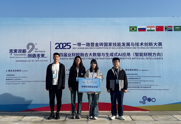 9月20至21日,2025“一带一路”暨金砖国家技能发展与技术创新大赛第四届业财税融合大数据与生成式AI应用(智能财税方向)赛项全国总决赛在河南信息统计职业学院举行。我校财会金融学院王子欣、张婧菁两位教师指导的孟一凡、孙虎、傅若曦、李梅四名学生组成的代表队以总分第二的成绩荣获全国一等奖。
