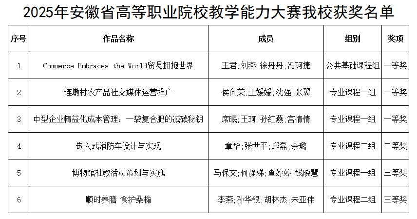 近日,安徽省教育厅公布2025年安徽省高等职业院校教师教学能力比赛获奖名单。学校教师凭借扎实的教学功底、创新的教学设计与出色的现场展示,斩获一等奖3项、二等奖1项、三等奖2项,比赛成绩位居全省前列。