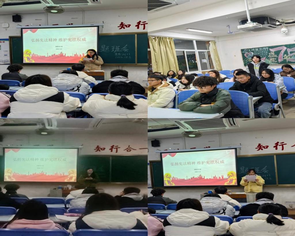 主题班会,弘扬宪法精神,维护宪法权威。党务2401班精心组织了一场以宪法学习为主题的班会。辅导员通过PPT展示,深入浅出地讲解了宪法的重要地位和基本内容,让同学们对宪法有了初步的认识和理解。随后,同学们踊跃参与讨论,纷纷分享自己在日常生活中对宪法的感悟和体会。有的同学提到,宪法是公民权利的保障书,它时刻守护着我们的基本权利;有的同学则表示,通过学习宪法,更加明确了自己作为公民的责任和义务。在互动环节,班级还组织了宪法知识问答竞赛,同学们分组参加竞赛,现场气氛热烈。