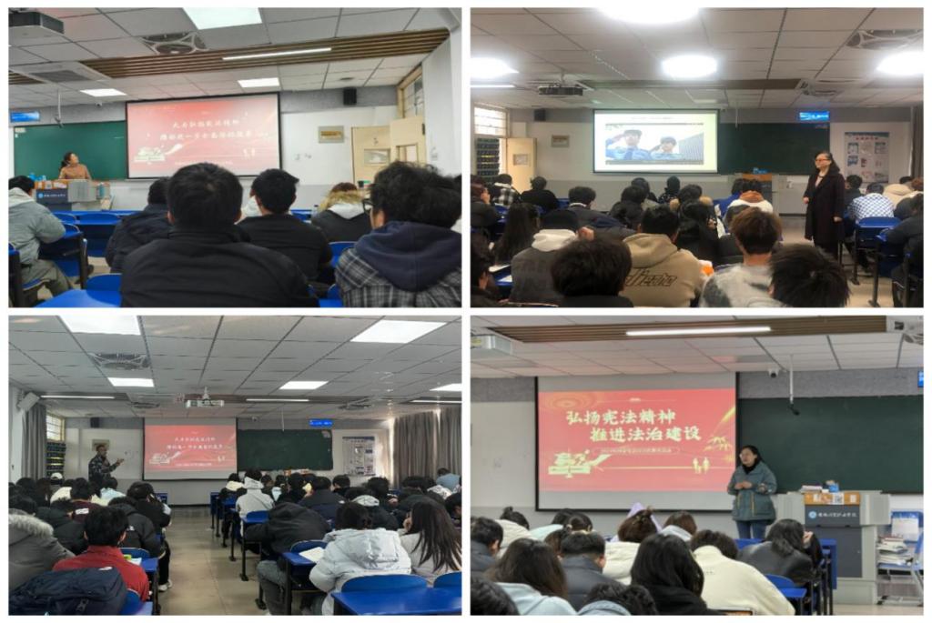 课堂理论教学,聚焦理论教学,筑牢依法治理根基。马克思主义学院利用“形势与政策”课程开展“大力弘扬宪法精神,推动进一步全面深化改革”主题教学,通过宪法普法视频、教师讲解和师生互动,了解新中国宪法发展历程和宪法的地位作用,明确习近平法治思想、新中国成立75年来特别是党的十八大以来全面依法治国取得的历史性成就、依宪执政的实施路径。