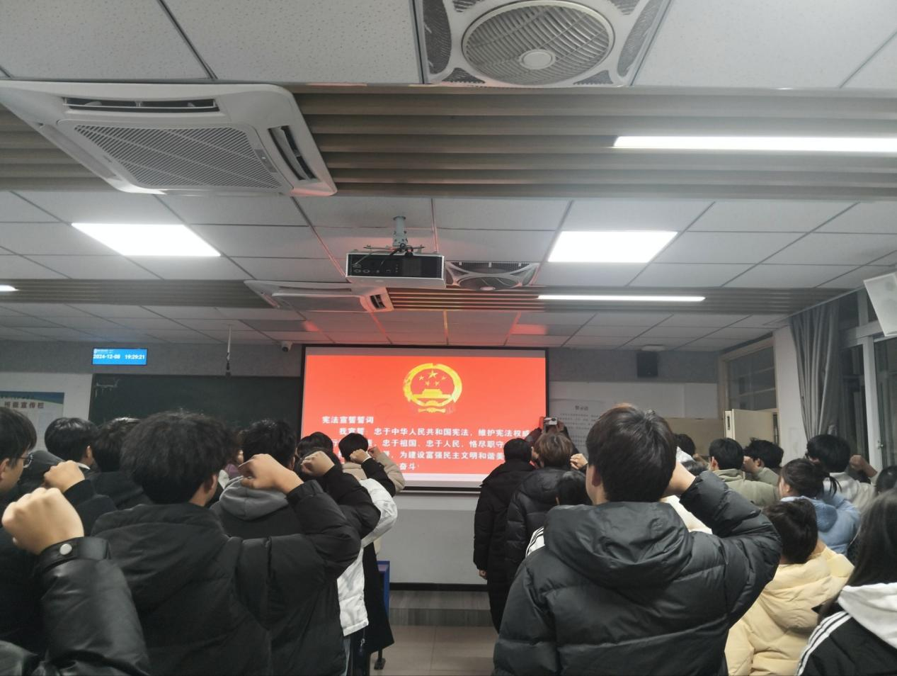 宪法宣誓:庄严承诺,法治启航。活动伊始,学院组织了庄重而神圣的宪法宣誓仪式。学生们举起右拳,面向国旗,庄严宣誓,承诺遵守宪法和法律,维护国家尊严和利益,用实际行动践行法治精神。这一环节不仅让学生们深刻感受到了宪法的权威与尊严,更激发了他们内心的爱国情怀与责任感。