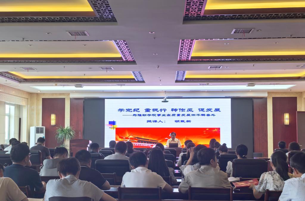 7月3日下午,学校党委委员、副校长胡戴新在翡翠校区行政楼311会议室以《学党纪 重执行 转作风 促发展》为题讲授纪律专题党课。文化创意学院党总支、学生处党支部、财务处党支部、图书馆党支部、现代教学技术中心党支部全体党员参加学习。