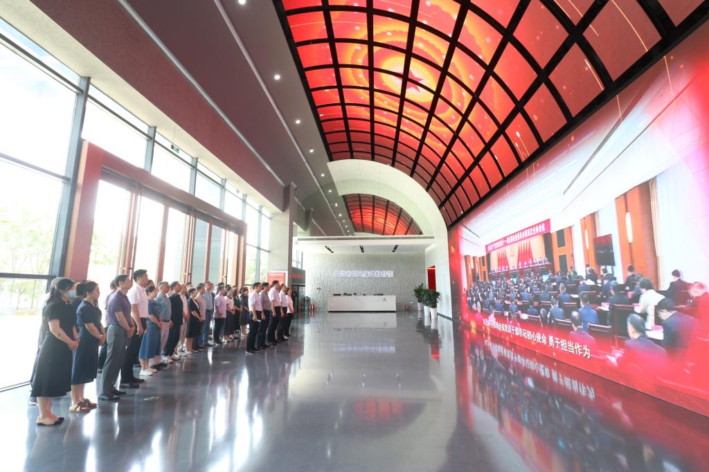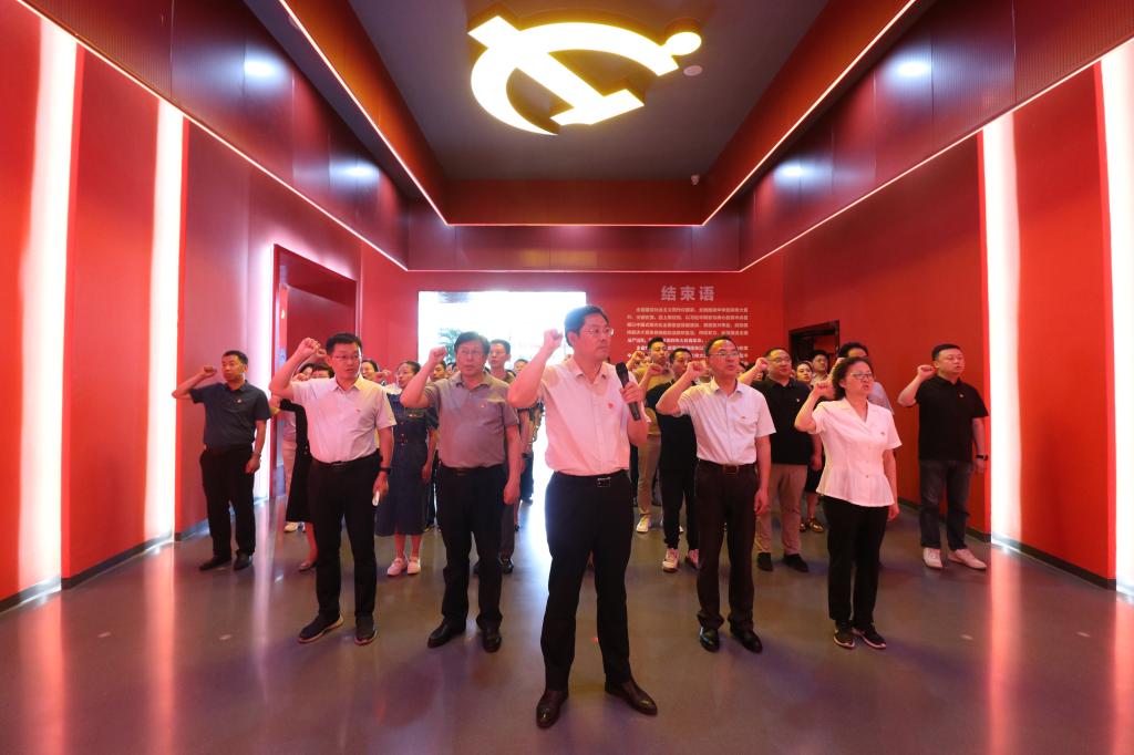 全体党员干部认真观看了《永远在路上》专题片,参观了“纪律立党·全面从严治党”“廉润江淮·清风扬帆”“以案为鉴·警钟长鸣”“不忘初心·永葆清廉”等展厅。展览通过影片与解说、互动查询、场景还原、体验空间等方式,全方位展示了中国共产党筚路蓝缕的百年纪律建设史和安徽省全面从严治党、党风廉政建设和反腐败斗争成果。馆内极具冲击力、感染力的典型案例图片、影像,引人深思、发人深省,使全体党员干部切实体会到触碰红线、逾越底线的惨痛代价。最后,在校长吴成颂的带领下,全体党员干部整齐列队,面向党旗,重温入党誓词。