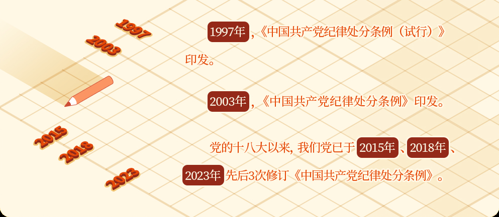 2023年12月,中共中央印发了修订后的《中国共产党纪律处分条例》,这是党的十八大以来,我们党第3次修订《中国共产党纪律处分条例》。下面,我们一起回顾《条例》如何与时俱进,不断修订完善。