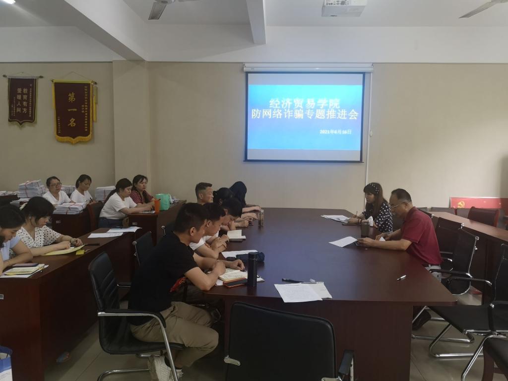 6月16日下午,经济贸易学院在212会议室召开防范电信网络诈骗工作专题推进会,对防范电信网络诈骗工作进行再安排、再部署。学院党总支书记陶云龙主持会议,全体辅导员老师参会。