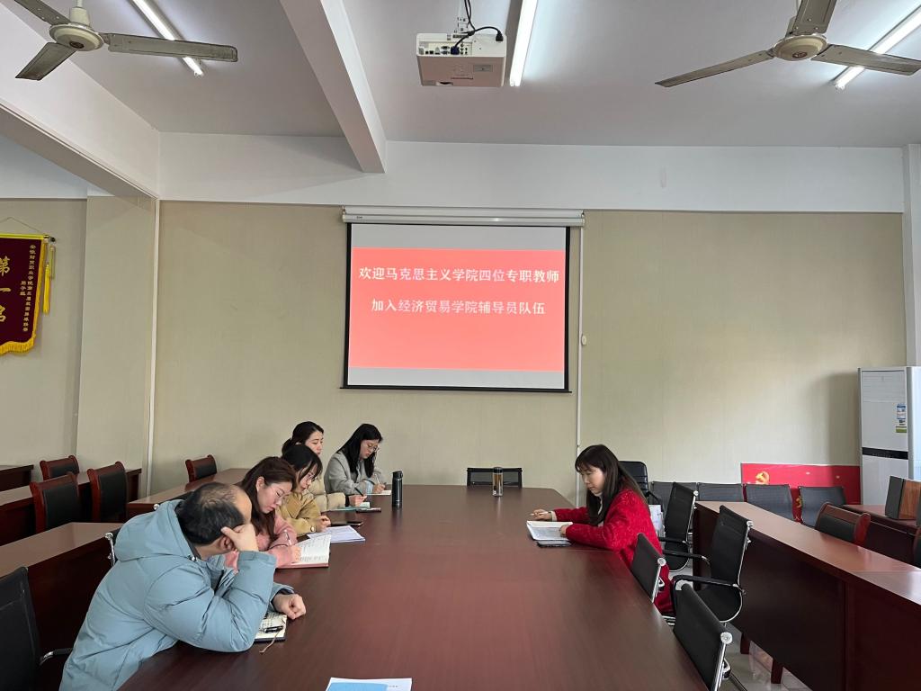 3月2日中午,经济贸易学院热烈欢迎孙全芳、吴梦、刘雅贤、夏静茹四位马克思主义学院专职教师加入经济贸易学院辅导员队伍。会议由经济贸易学院党总支副书记丁蓉主持,团总支书记张超、学生秘书孙建华、刘桂芳参加会议。