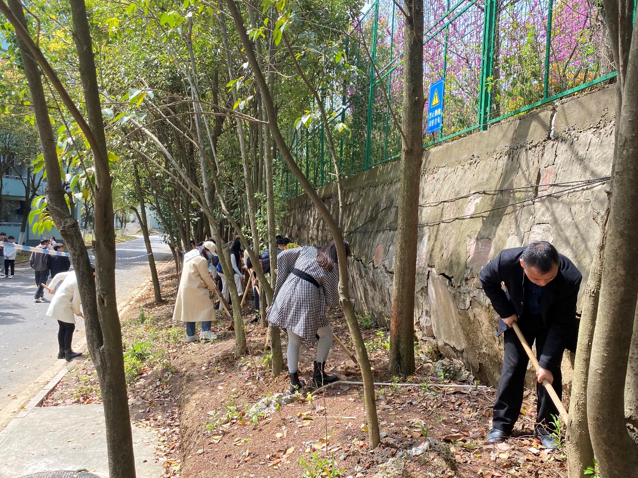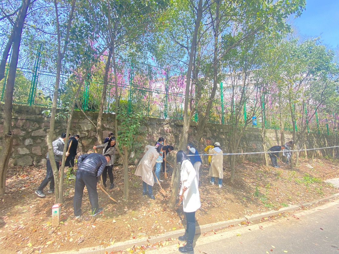 绿色映底蕴,山水见初心。在活动现场,各位老师以及团学干部们撸起袖子,分发工具,挥锹培土、覆土除草,清理垃圾和碎石,每个环节衔接有序,配合默契,一个多小时的辛勤劳动,一棵棵树苗焕发出新的勃勃生机。大家劲往一处使,汗往一处流,干得热火朝天,呈现了一片“党旗红,党员添绿意”的繁忙景象。