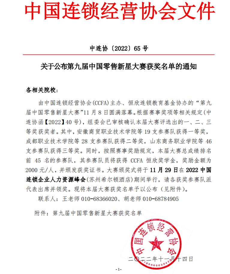 11月18日,由中国连锁经营协会(CCFA)主办的“第九届中国零售新星大赛”圆满落幕。经过激烈的角逐,来自我校连锁经营与管理专业的周海龙、丁静文两位同学,顶住压力,表现出色,荣获全国一等奖。