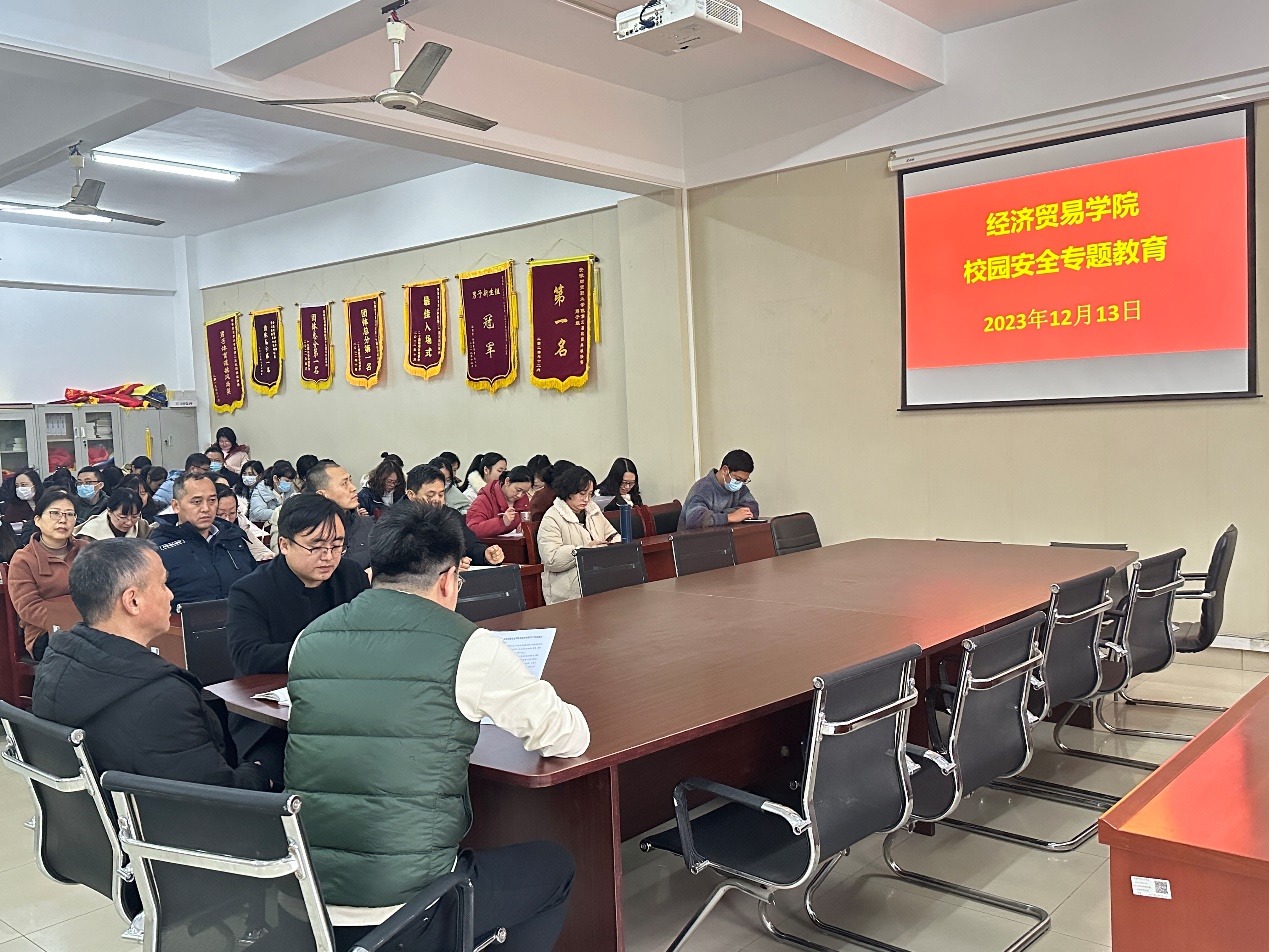 为进一步增强师生的安全意识,扎实推进校园安全工作,2023年12月13日下午,经济贸易学院党总支组织全体教职工在212会议室开展校园安全专题教育,经济贸易学院副院长曹宝亚主持会议。