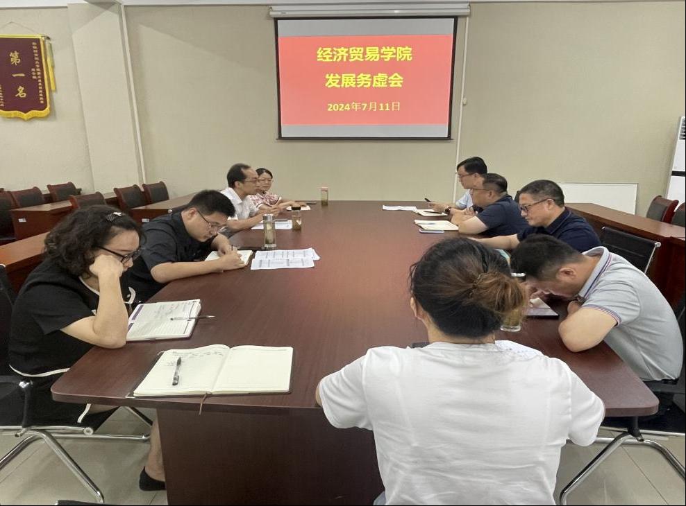 7月11日,经济贸易学院组织召开发展务虚会。经济贸易学院院长黄诗义、副院长曹宝亚、王伟浩及各教师党支部书记、教研室主任参加会议。会议由党总支书记刘大俊主持。
