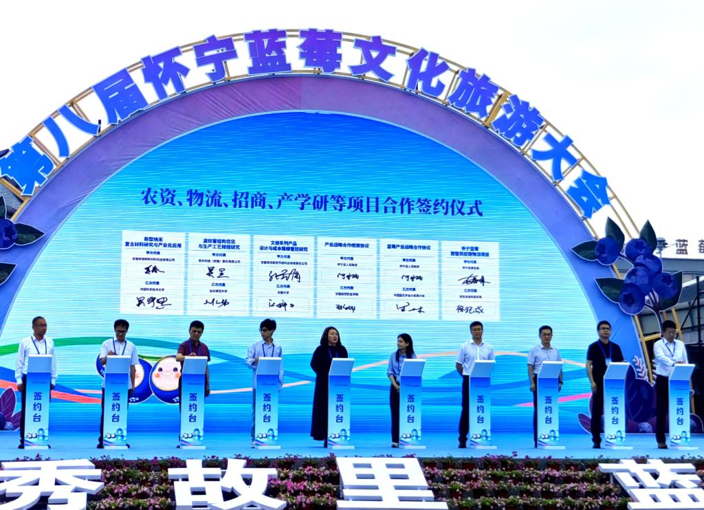 大会现场,蓝莓飘香,活动精彩纷呈。王海龙深入了解了怀宁蓝莓产业在农业育种、产品深加工、文化旅游融合等方面的最新成果与发展态势。怀宁蓝莓产业作为地方特色产业,在推动经济发展、促进乡村振兴方面成效显著。会上,王海龙代表学校与怀宁县政府签订了产业战略合作框架协议。