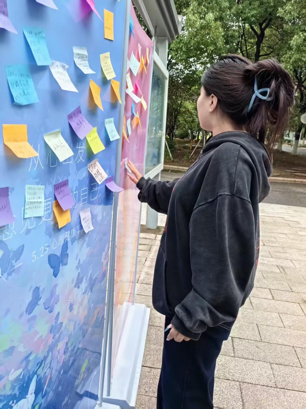 活动现场设置“情绪投递站”“情绪盲盒”和“情绪树洞”留言墙三个环节。在“情绪投递站”环节,参与者领取空白卡片,写下近期最想分享的情绪或故事,并将其投入对应的盲盒箱。“情绪盲盒”环节中,参与者可随机抽取情绪卡片,写下鼓励话语并交还工作人员。现场还设置了“情绪树洞”留言墙,参与者用便利贴写下心声或感悟,与其他同学分享。