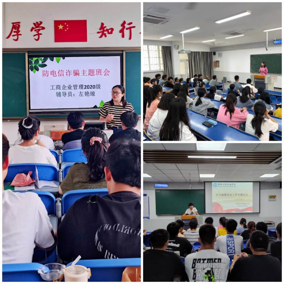 从开学至今,经济贸易学院全体辅导员通过线上线下全方位、多角度、立体的向全体在校生、外出顶岗实习学生、大一入学新生,通过开学第一课主题班会、人人安装国家反诈中心app、每天班级群的QQ警情通报、寝室长的每日督促、主题班会的谆谆教诲、辅导员的个别谈话等,从心理辅导入手杜绝学生防范意识薄弱,贪心、虚荣、占小便宜等容易受骗心理,真正做到24小时无间断,无死角的关注每一位学生,总结整理防诈骗顺口溜“莫贪小、莫转账、打电话”,广而告之。