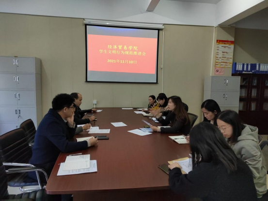11月10日中午经济贸易学院在综合楼211办公室召开学生文明行为规范推进会,通过教职工大会和学生党支部会议对我院校园文明规范工作进行周密部署。会议中,学生党支部书记丁蓉传达了学校关于加强学生校园文明规范的通知,将我院校园文明规范活动安排进行详细解读,并将各项责任落实到个人,争取做到职责匹配、高效执行。务求为期一个多月的校园文明规范活动从宣传启动、系列活动开展、文明督导执行、活动总结四个环节圆满落实,势必在经济贸易学院掀起一阵校园文明之风。参会成员纷纷对校园文明规范活动安排表示高度认可,针对具体活动开展提出细思、巧思,为提升校园治理水平和学生文明素质出谋划策。
