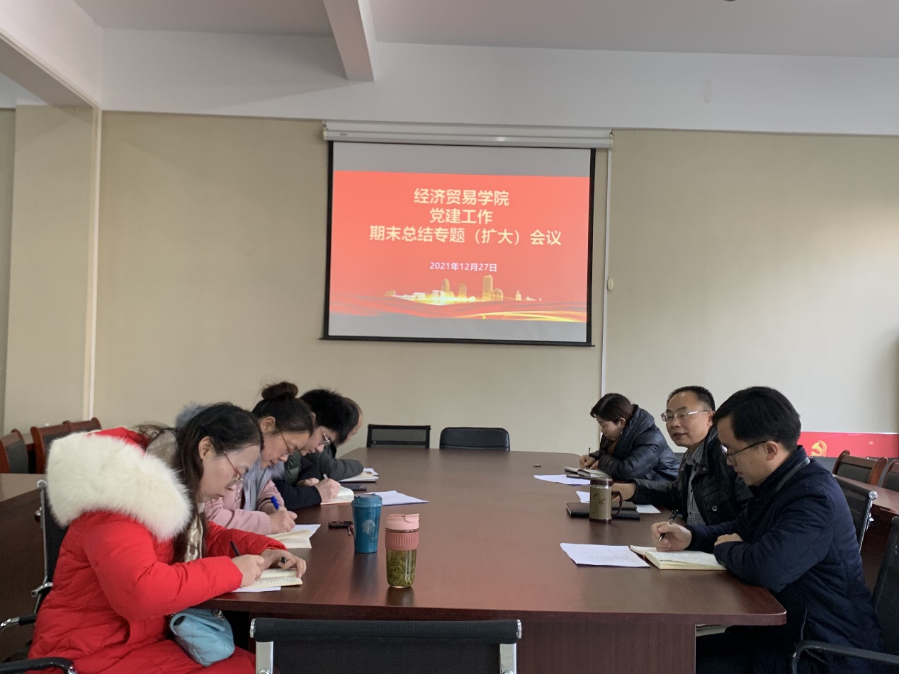 12月27日中午,经济贸易学院党总支委员会在综合楼212办公室举行了2021-2022学年第一学期党建工作总结会。党总支书记陶云龙,党总支副书记丁蓉,纪检委员曹宝亚,组织委员张超,宣传委员张奇,教师第一党支部书记朱清,教师第二党支部书记马诗琴参加了本次总结会。