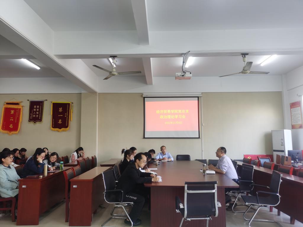 11月9日,经济贸易学院组织开展党的二十大精神政治理论专题学习会,经济贸易学院党总支书记陶云龙主持会议,经济贸易学院全体教师参加。