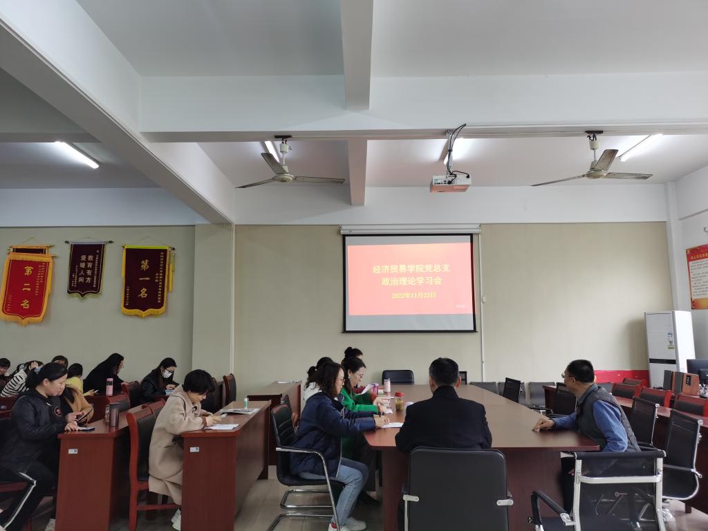 11月23日,经济贸易学院组织学习中国共产党第二十次全国代表大会关于十九届中央委员会报告的决议,经济贸易学院党总支书记陶云龙主持会议,经济贸易学院全体教师参加。