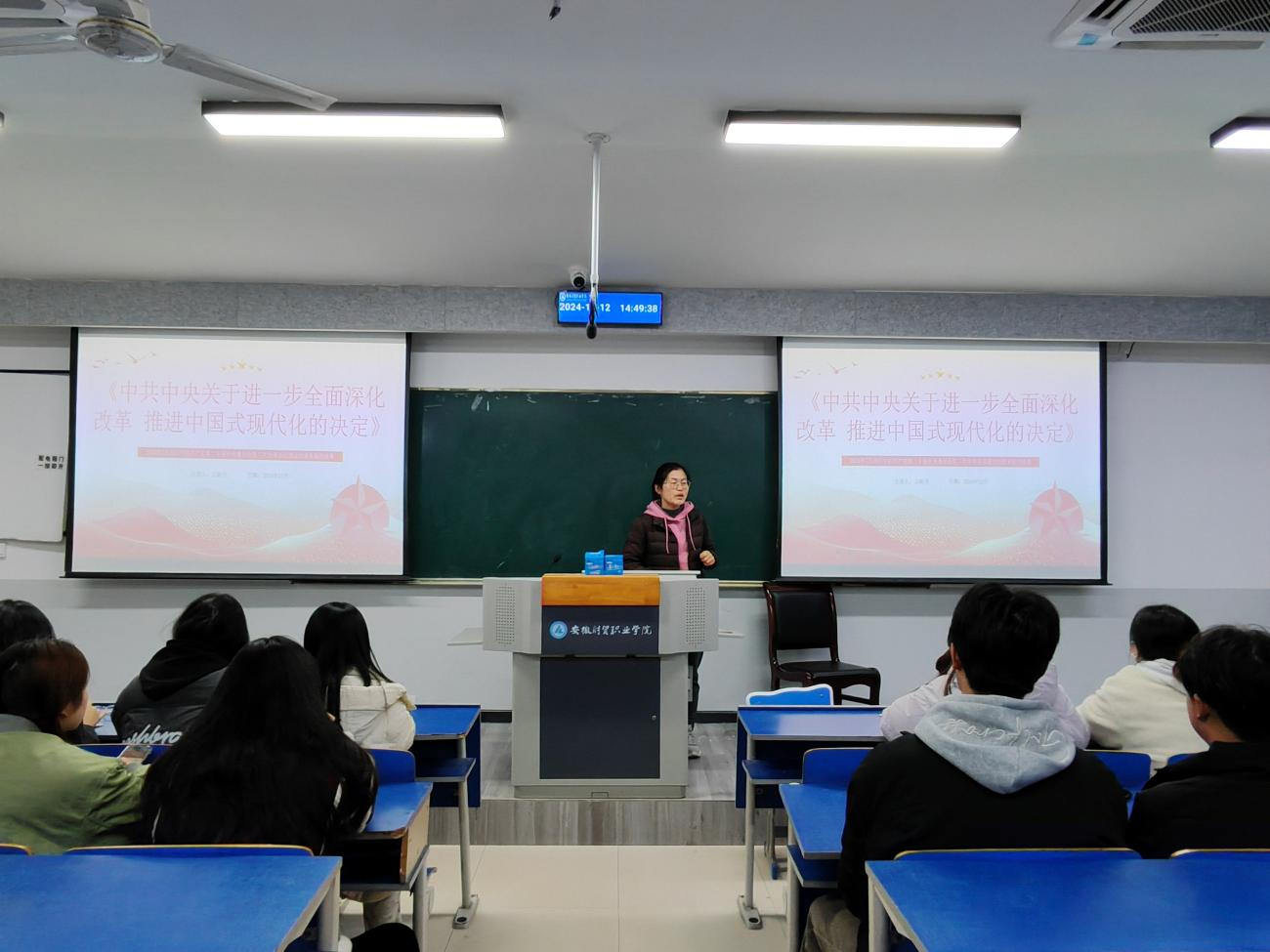 近日,经济贸易学院学生党支部组织委员占陈芳在5201阶梯教室开展学习贯彻党的二十届三中全会精神专题宣讲,各班级入党积极分子、共青团员、思政委员等到场参加。