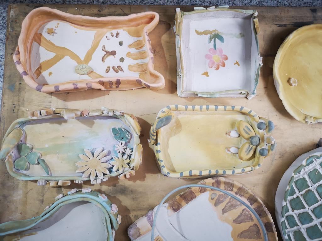 在老师的示范下,同学们亲自感受做泥条盘筑的乐趣,每人都按照规范动作制做自己的陶艺作品,做底盘,搓泥条,根据自己想法设计从下向上盘筑成型,再用手和工具将里外修饰抹平,使之成器。老师在一旁指导,使同学们的作品更加牢固,方便日后烧窑。这是一段与心灵沟通的体验,让同学们更深刻地了解陶艺的基本知识,认识泥条造型的美感。除此之外,何老师还耐心教授同学体验拉胚成型,把泥土甩在拉胚机圆盘面的中心,用沾水的手抱正抱顺,然后在泥团上部的中间部位扣出一个窝来,并上提把窝拔高来塑造各种形状,何老师在一旁帮同学们把泥土扶正,指导不同形状的罐子如何拔高按压和塑型。在拉胚过程中,锻炼了同学们的动手能力与耐心,对艺术有了更深的了解。每一个陶艺作品都需要一周时间进行风干,再进行釉下绘画。