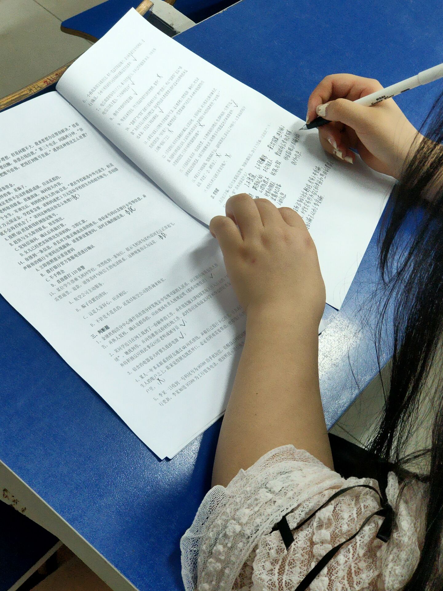 本次竞赛采用笔试方式进行,试卷由单选题、多选题、判断题和简答题四部分构成。考试中,同学们遵守考场的纪律,按照考场的要求,认真做答。此次竞赛考题设置常见的刷单类诈骗、贷款类诈骗、冒充客服退款等各种诈骗类型为主要内容,进行现场答题,同学们准备充分、态度认真、耐心应对,利用所掌握的电信诈骗知识和反诈技巧熟练答题。比赛中,所有参赛同学对竞赛保持高度重视,做题时专心致志,奋笔疾书六十分钟,将竞赛当做真实考验认真对待,力求识破诈骗份子的各种套路,取得防诈骗的全面胜利。
