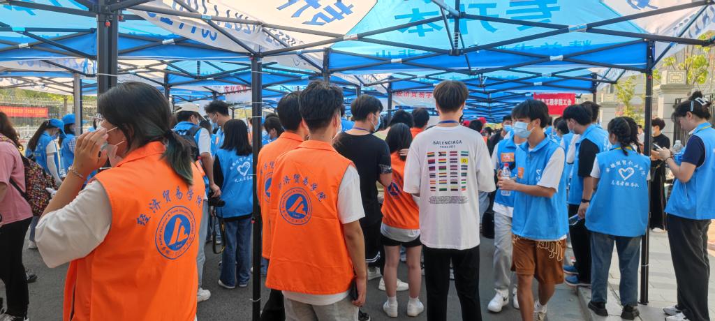 9月17日,为了解决新生报到时“行李多、不好拿”等问题,经济贸易学院安排了123位21级志愿者,提前了解新生的进校需求,组成志愿者服务队为新生提供热情周到的服务。迎新工作上午七点正式启动,志愿者们穿戴好统一的马甲和工牌,在学校的各个接待点等待新生入校。