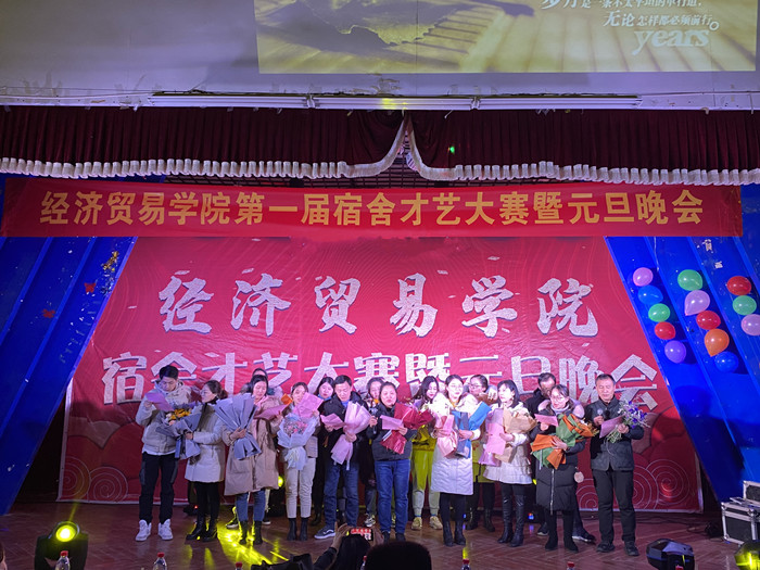 师生同乐辞旧岁,欢歌笑语庆新年。12月29日晚,经济贸易学院第一届宿舍才艺大赛暨元旦晚会在5103教室举行。经济贸易学院党总支书记陶云龙、副书记丁蓉、团总支书记张超及各新生班级辅导员到场观看了晚会,与同学们共迎新年。