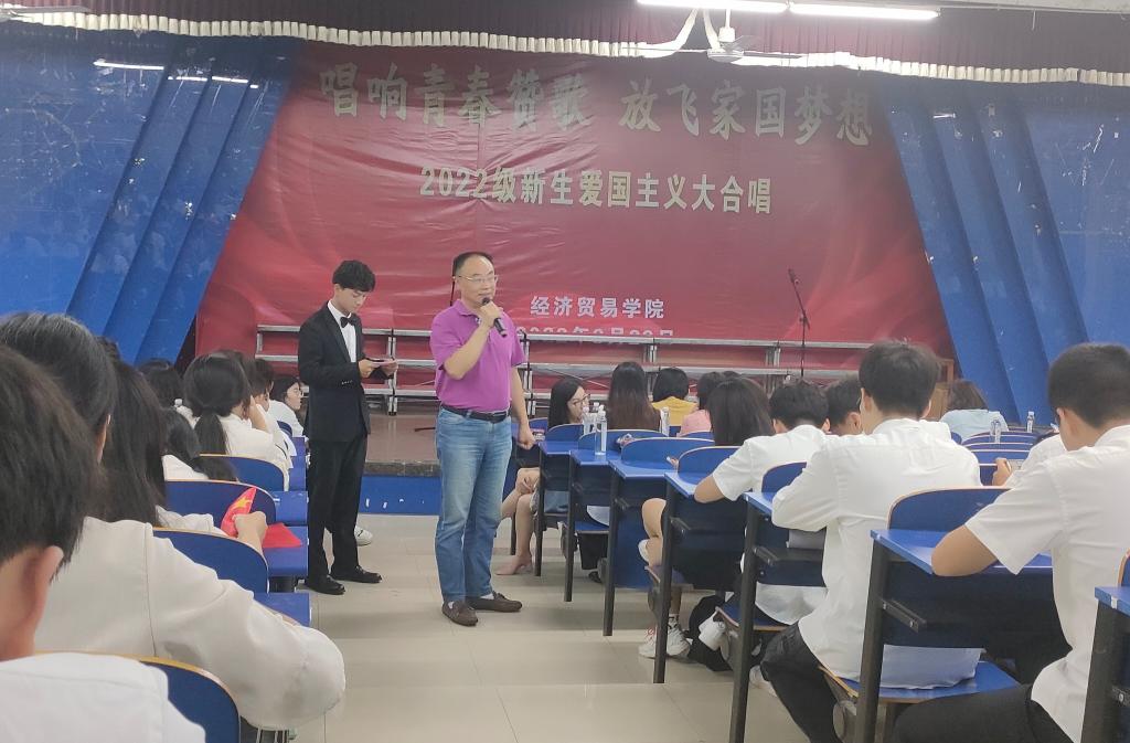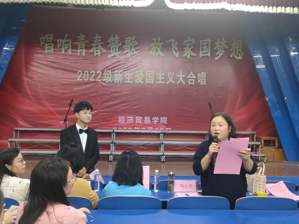 近日,经济贸易学院在5103教室举办了主题为“唱响青春赞歌,放飞家国梦想”的新生爱国主义大合唱。经济贸易学院党总支书记陶云龙、副书记丁蓉及图书信息中心主任张琼、学生秘书刘桂芳、教学秘书陆何薇老师、专职辅导员周艳阳、陈亮担任本次活动的评委,全体2022级新生辅导员到场观赛。