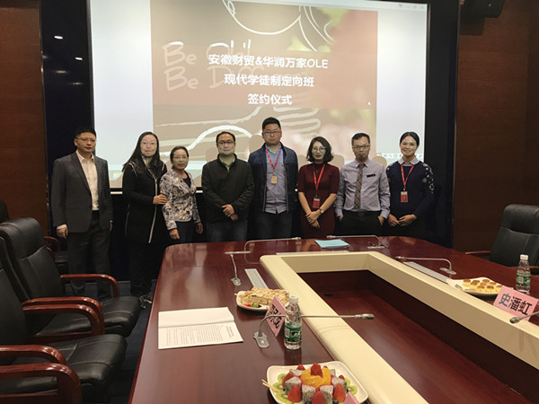 10月26日,行知管理管理学院副院长刘大俊,专职教师陆影、高皖秋、夏承龙一行赴上海华润万家华东区总部参加与上海华润万家超市有限公司共建现代学徒制定向班签约仪式,并就现代学徒制的人才培养体系做了深入讨论。上海华润万家超市有限公司总经理黄军、人力资源总监陈亚玲、华润万家OLE南京路店店长陈式松、配置经理陈汝清、招聘经理史潘红参加了签约仪式。
