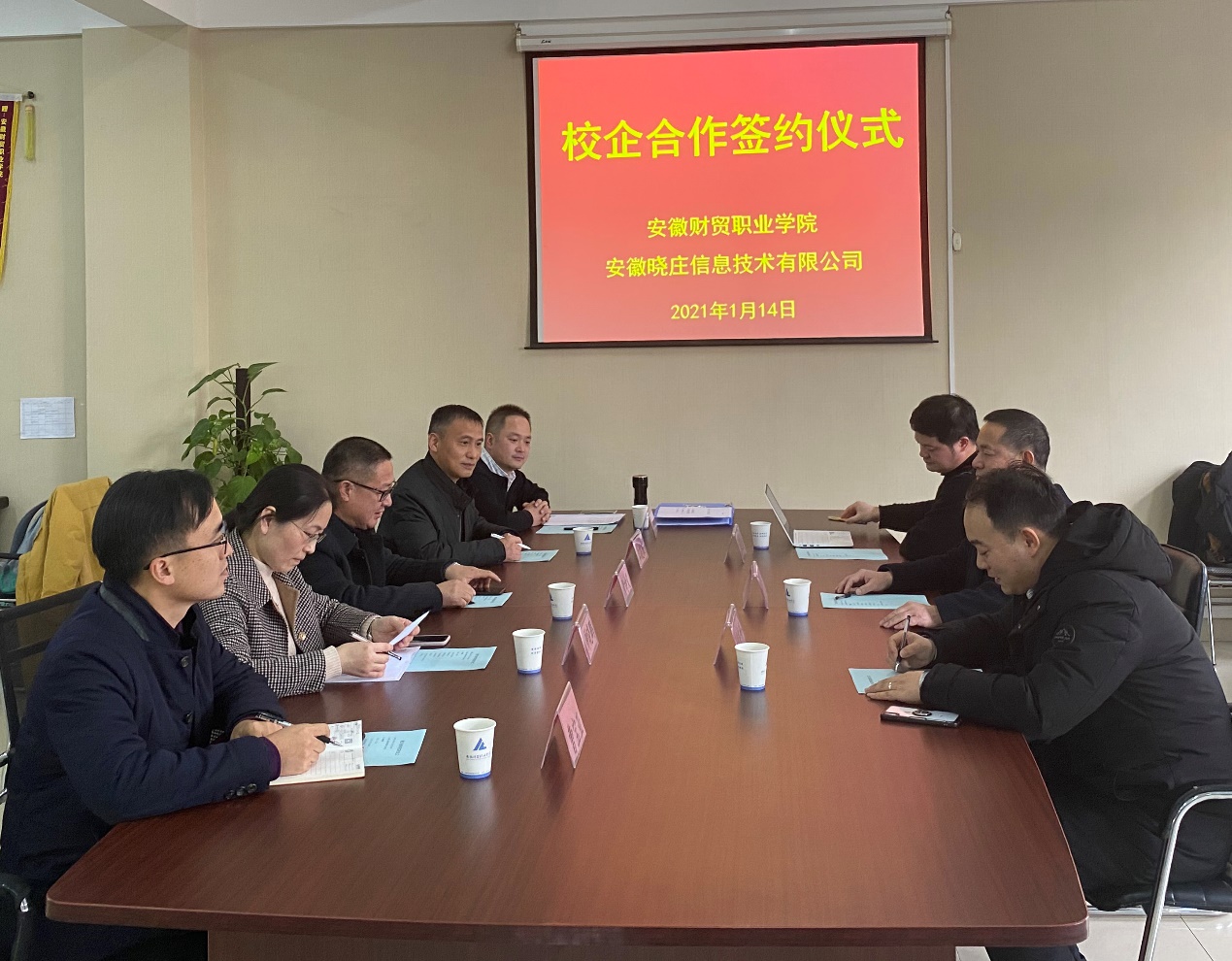 1月14日下午,经济贸易学院与安徽晓庄信息技术有限公司校企合作签约仪式在综合楼212会议室举行。上海晓庄教育信息咨询有限公司总经理肖学彪、安徽晓庄信息技术有限公司总经理席东升、技术总监程达量,教务处副处长钟晓鹏、经济贸易学院院长黄诗义、副院长曹宝亚等出席签约仪式,副院长江友农主持签约仪式。