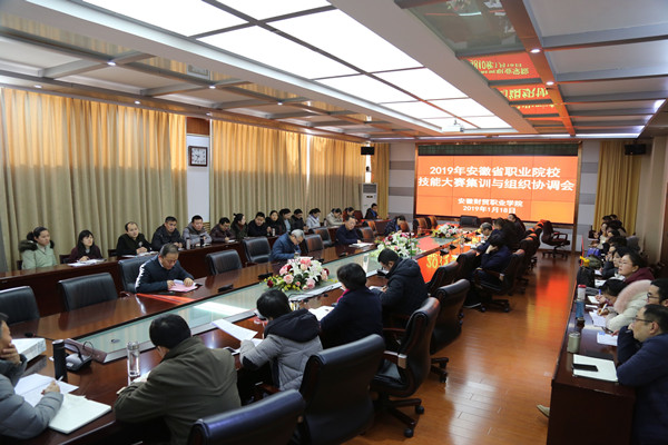 1月18日上午,学校召开2019年安徽省职业院校技能大赛集训与组织协调会,校长刘银国、副校长罗虹、校长助理徐峰出席会议,教务处、保卫处、总务处、现代教育技术中心、各院部负责人和技能大赛项目指导教师参加会议。大会由校长助理邓庆安主持。
