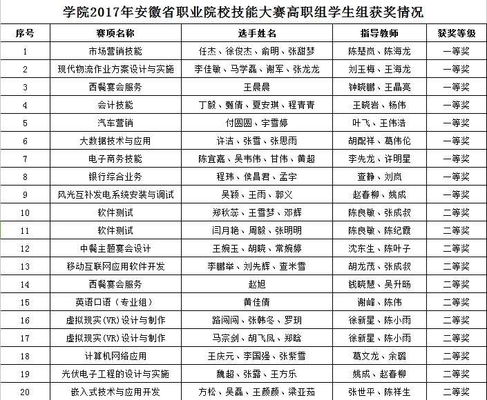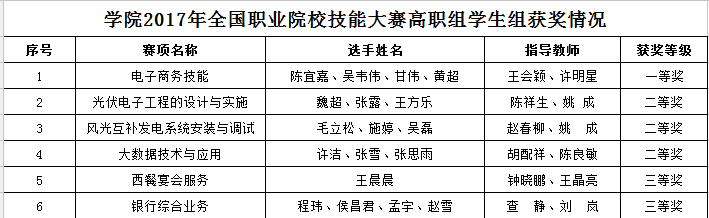 职教成就梦想,技能点亮人生。长期以来,学院坚持以就业为导向,以质量为生命,狠抓人才培养质量,大力推进教育教学改革,不断深化校企融合、工学结合。今年,许多合作企业都对学院参赛给予了各个方面的大力支持。在各方的共同努力下,在省赛中,学院共获得一等奖9个,二等奖12个,三等奖13个,总分全省排名第七,获优秀组织奖;国赛中,学院获一等奖1个,二等奖3个,三等奖2个,创历史最好成绩。
