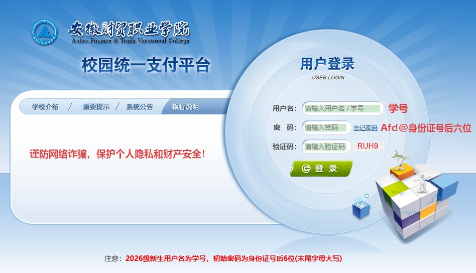 【登录方式】 用户名:学号(录取查询窗口获取),初始登录密码:Afc!@+证件号后六位。