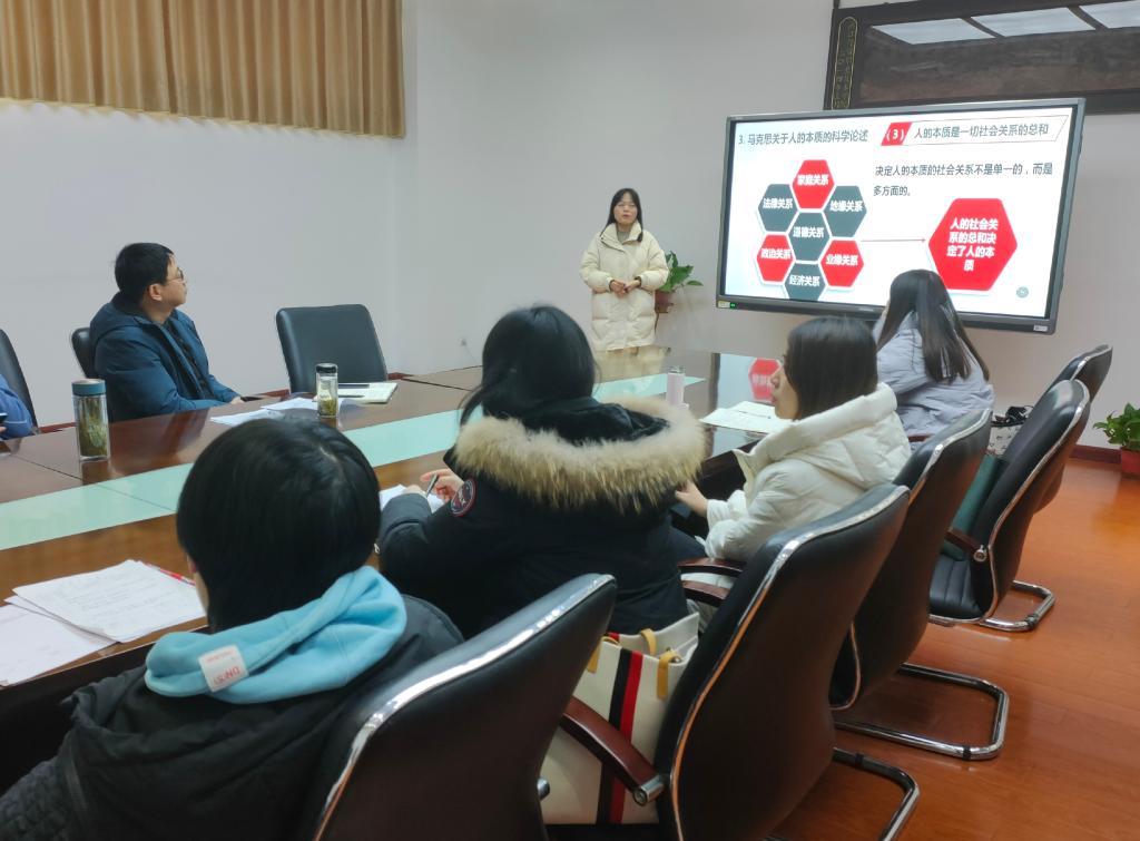 徐明教授结合自己多年的课堂教学感受谈到,思政课堂在讲授理论时可进一步阐述时代背景和历史知识的补充,便于学生理解。徐莲教授认为重点理论知识要让学生重点掌握,给学生讲清楚讲明白,对于教学重点和难点问题,大家可以多多进行探讨,力争找到最好的教学切入点。其他老师也纷纷提供了备课和授课过程中的实用典型案例,进行了共同讨论和交流。