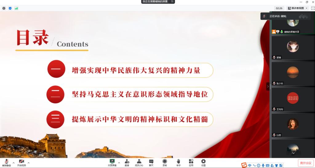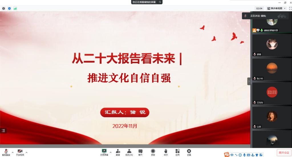 为进一步学习宣传贯彻党的二十大精神,11月2日,马克思主义学院党支部宣传委员储锐通过线上腾讯会议主讲主题党课。马院全体党员教师参加。