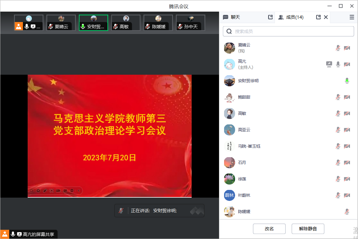 7月20日,马克思主义学院教师第三党支部线上召开政治理论学习会议,第三党支部全体党员参会,会议由第三党支部副书记高亢主持。