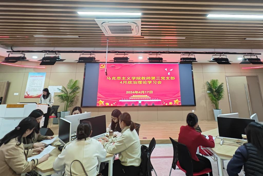 4月17日下午,马克思主义学院教师第三党支部召开四月份政治理论学习会议,全体党员参会。