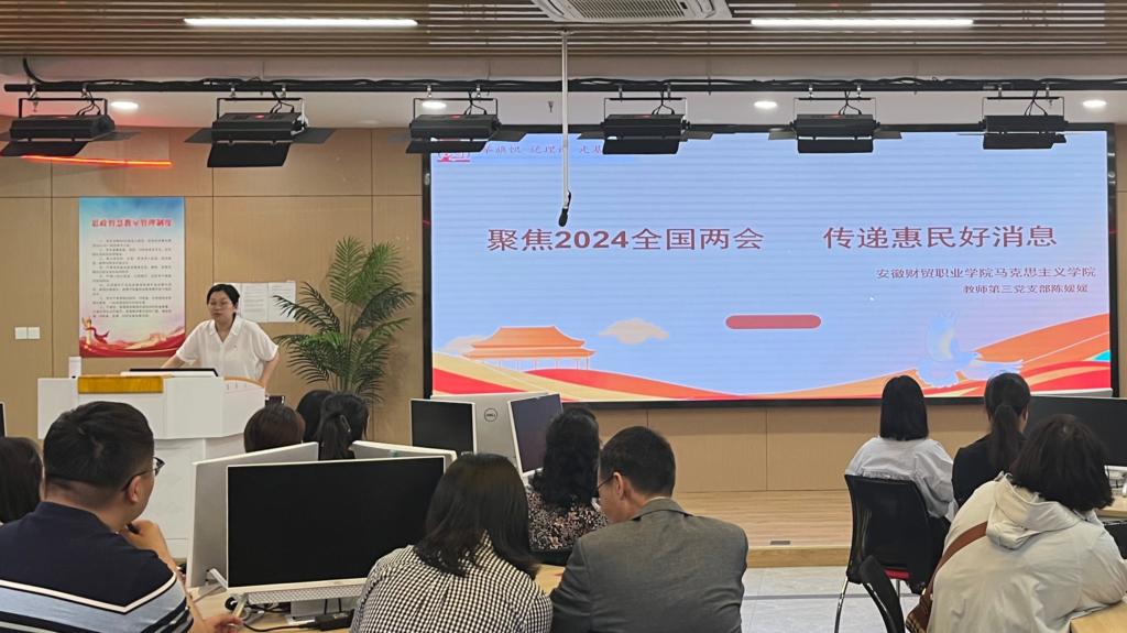 活动中,马克思主义学院教师第三党支部陈媛媛老师以《聚焦2024全国两会 传递惠民好消息》为题,以2024全国两会报告中的民生热词为切入点,深度剖析2024年全国两会报告坚持以人民为中心的发展思想,切实履行好保基本、兜底线的职责,在就业、医疗、教育、健康、养老等领域,采取更多惠民生、暖民心的举措,扎实推进共同富裕,促进社会和谐稳定,不断增强人民群众的获得感、幸福感、安全感。