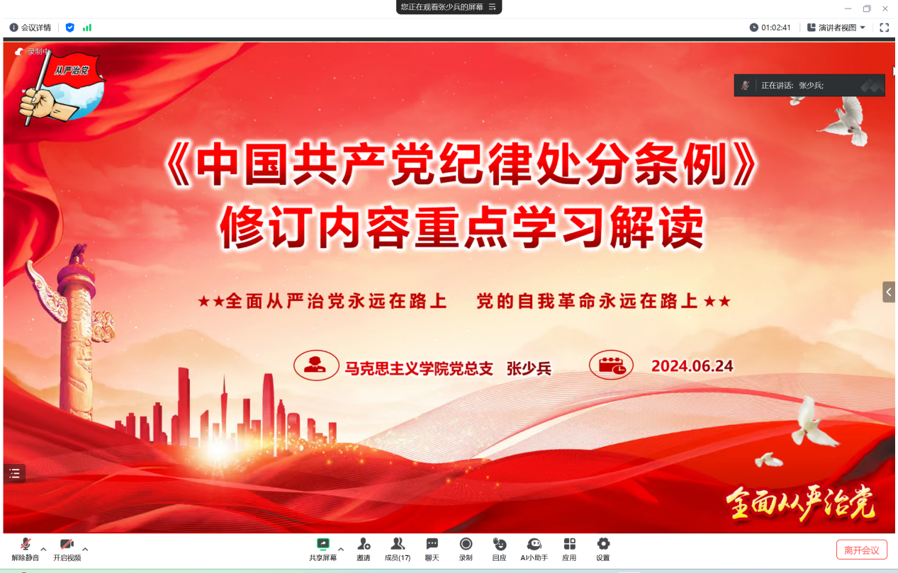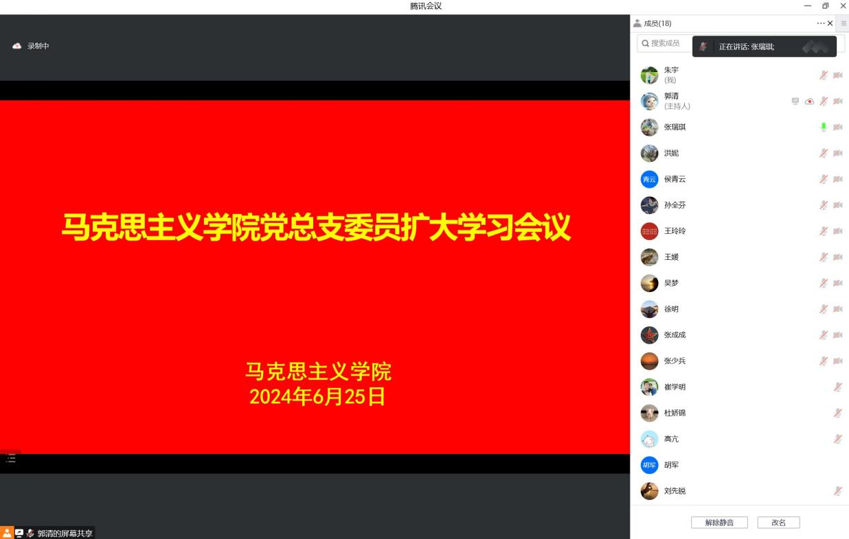 6月25日,马克思主义学院召开党总支委员扩大学习会议暨书记讲党课,会议由马克思主义学院党总支书记张少兵主持,总支委员、部分党员教师列席。