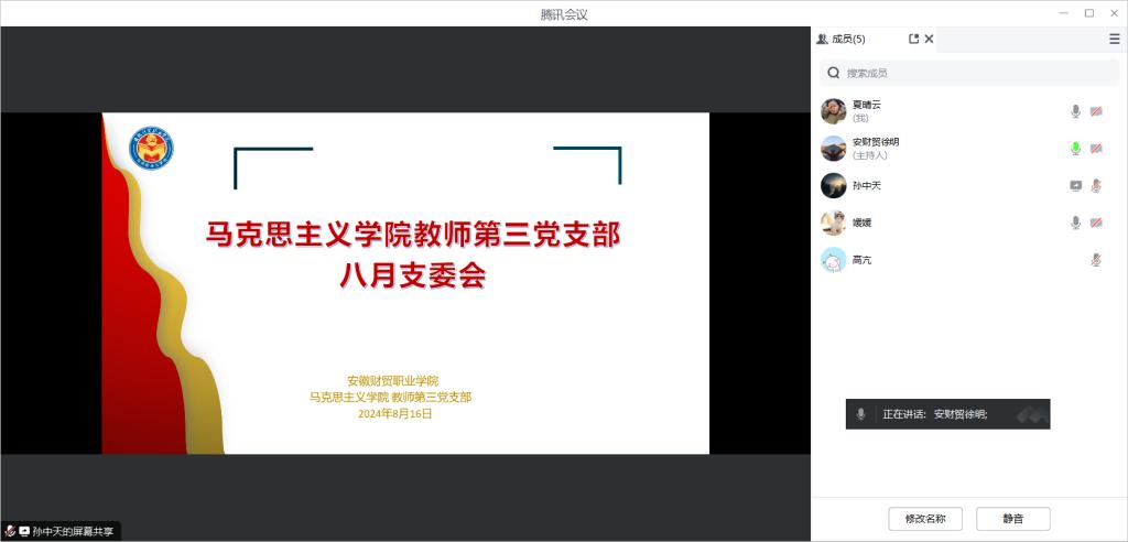 8月16日,马克思主义学院教师第三党支部召开八月份支委会,支部书记徐明主持会议,支部委员参加会议。