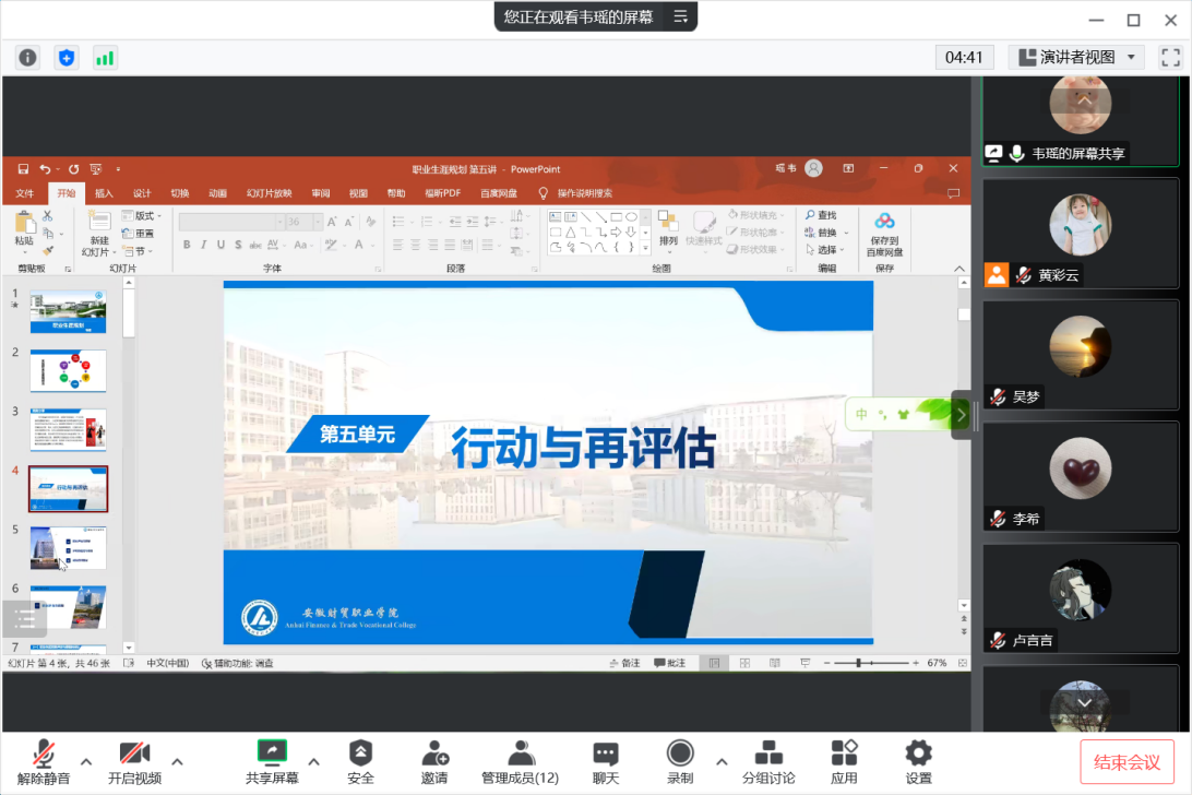 韦瑶老师对《职业生涯规划》课程第五单元《行动与再评估》课件的设计思路和逻辑结构进行了简要介绍,并分享了其在“职业生涯发展评估与调整”相关知识的结构设计时的自我思考。