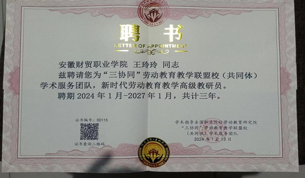 此外,协办校beat365在线唯一官网、鄂尔多斯应用技术学院、江苏省徐州技师学院、呼伦贝尔职业技术学院、内蒙古化工职业学院、新疆石河子职业技术学院、遵义职业技术学院、北京财贸职业学院、内蒙古农业大学职业技术学院、贵州省贵阳市商贸学校等代表,通过线上线下播放视频的方式分别介绍和展示了本校阶段性成果。我院王玲玲老师被聘为“三协同”劳动教育联盟校(共同体)学术服务团队,新时代劳动教育教学高级教研员。