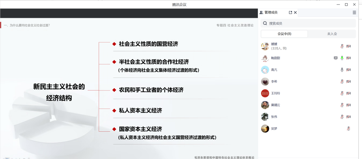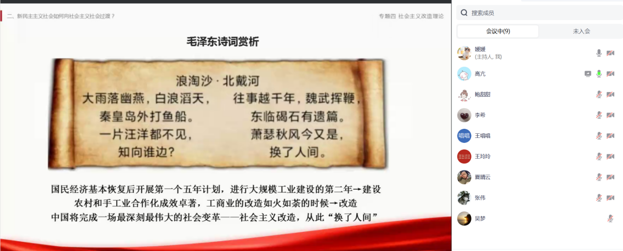 备课会由鲍甜甜老师、高亢老师主讲。鲍甜甜从《建党百年历史大事记:1921年——1949年》引入,分析新中国成立初期中国共产党所面临的经济状况和典型案例,重点阐述了新民主主义社会是一个过渡性社会、党在过渡时期的总路线及其依据;高亢从毛泽东诗词——《浪淘沙·北戴河》的赏析入手,通过分析社会主义改造过程中的典型案例和发展相关的数据,重点阐述了社会主义改造的主要内容和社会主义基本制度在中国的确立。